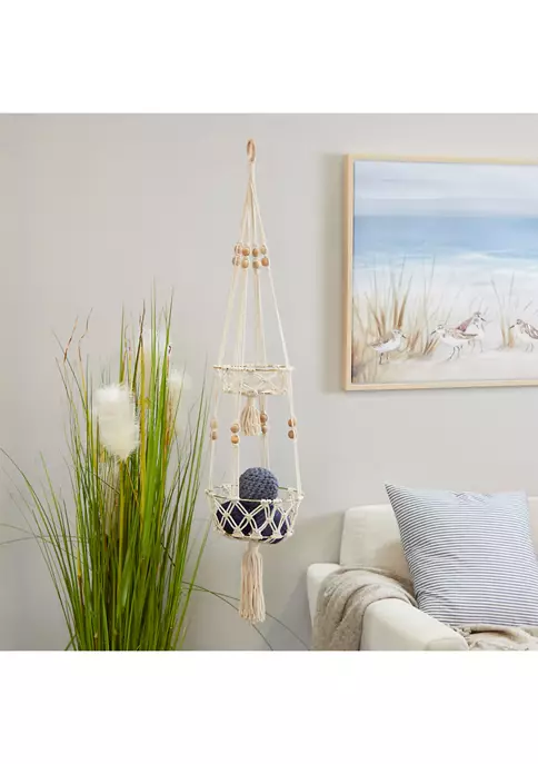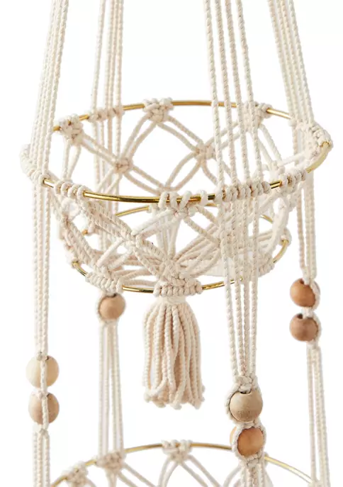 A boho inspired style that exudes creativity with a free-spirited design. Bohemian wall decor crafted of solid and quality fabric, iron, and bead materials. A decorative wall accent highlighting white, gold, and brown finishes that are easy on the eye. Macrame plant hanger features 2-tiered round metal holder made up of weaved and knotted cotton rope adorn with decorative tassels, and brown bead accents. Item measures 10”L x 10”W x 49”H and weighs 1.20 lbs