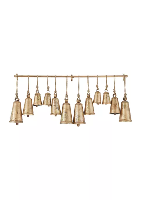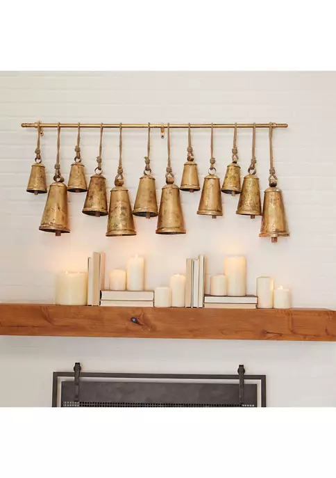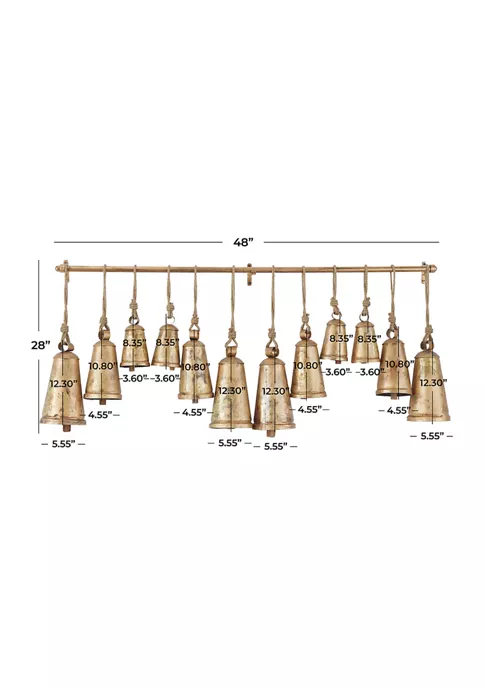 Designed with a rustic influence that can seamlessly transition to farmhouse, bohemian, and eclectic style interiors. Meditation bells are crafted from quality iron, mango wood, and jute rope materials. Create a captivating focal point in the home with these rustic brass bells, designed with a weathered finish, thin brass rod, and brown jute hanging rope for an old-world appeal. Whimsical bells provide a warm and welcoming way to elevate the look of your space by adding dimension and texture to the home, and can be used either hanging or spread across a console table or mantle. The bells measure 48โL x 5โW x 28โH, 5.55โL x 5.55โW x 12.30โH, 4.55โL x 4.70โW x 10.80โH, 3.60โL x 3.70โW x 8.35โH; collectively weighs 12.2 lbs
