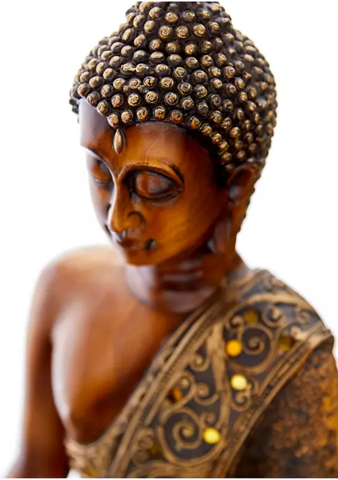 A boho inspired style that exudes creative form with a free-spirited design. Buddha sculpture sticks to the concept’s roots using a polystone construction. Distressed copper brown and bronze finishes are featured in this Sitting Buddha figurine. Decorative sculpture features ultra realistic detailing on the headwear, robes, and on the base. Sitting Buddha sculpture measures 15″ x 12″ x 6″ and weighs 4.88 lbs