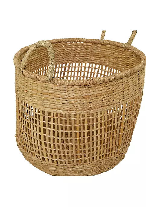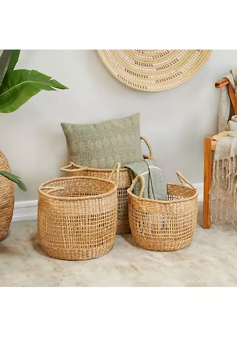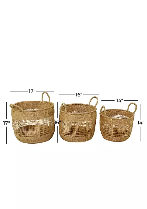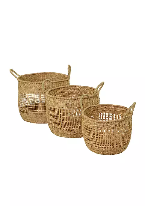 A boho inspired style that exudes creative form with a free-spirited design. Woven seagrass gives this set of storage baskets a solid and durable form. Natural brown finish highlights these 3 storage baskets. Open weave patterns in the mid sides of these storage baskets add character and texture to its unique wicker style. Items measure 16″D x 17″L, 15″D x 16″L, 13″D x 14″L and collectively weigh 3 lbs