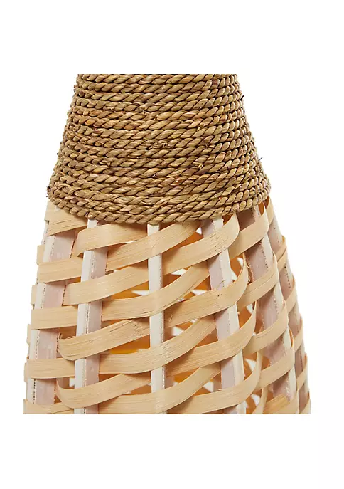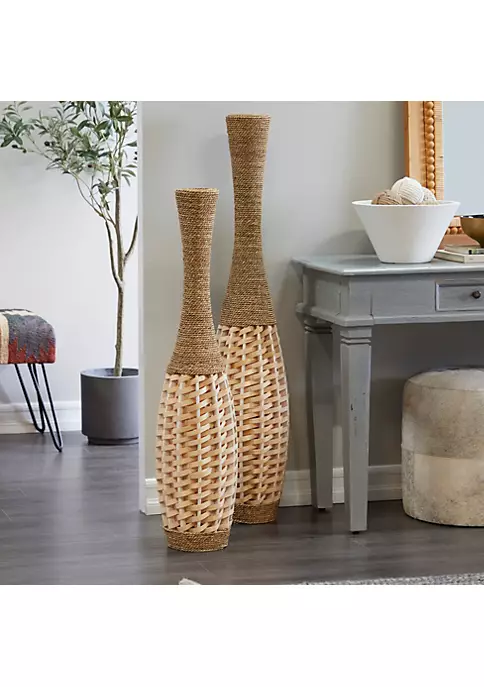 A boho inspired style that exudes creative form with a free-spirited design. Brown vase for home, crafted of natural bamboo and plant materials along with solid red pine wood. Intricate bamboo and plant bohemian vase featuring a brown finish that brings a natural vibe. Features light brown woven bamboo strips and dark brown coiled rope with deep setting ideal for long stem faux botanicals. Bamboo vase for decor measuring 7โD x 40โH and weighs 3 lbs