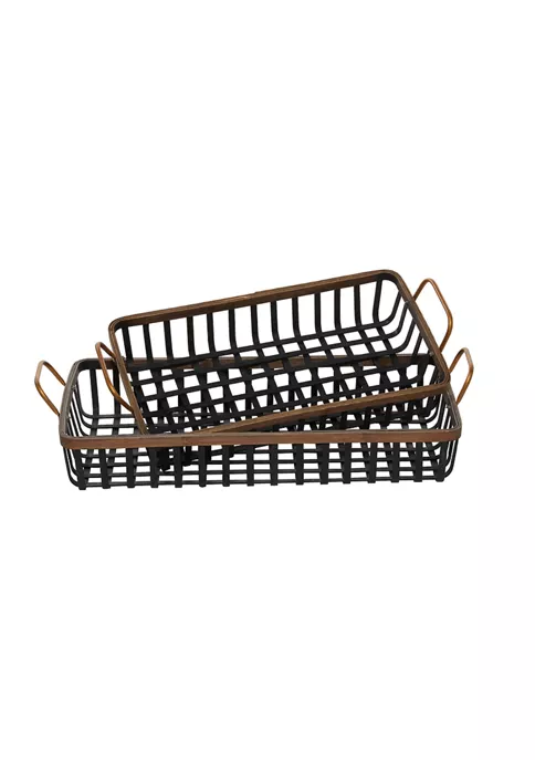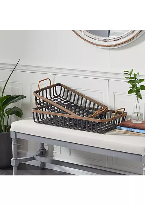 A boho inspired style that exudes creative form with a free-spirited design. Body is made of bamboo glued and bent together to meet at a frame of the same material. These decorative trays highlight matte black finish with natural wood brown side rim outline and handles. Each black and brown decorative tray features grid patterned basket details. Larger tray: 29″L X 14″W X 7″H; Smaller: 24″L X 13″W X 6″H; and together weights 2.77 lbs