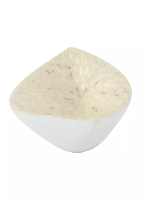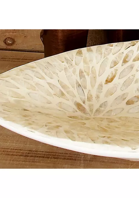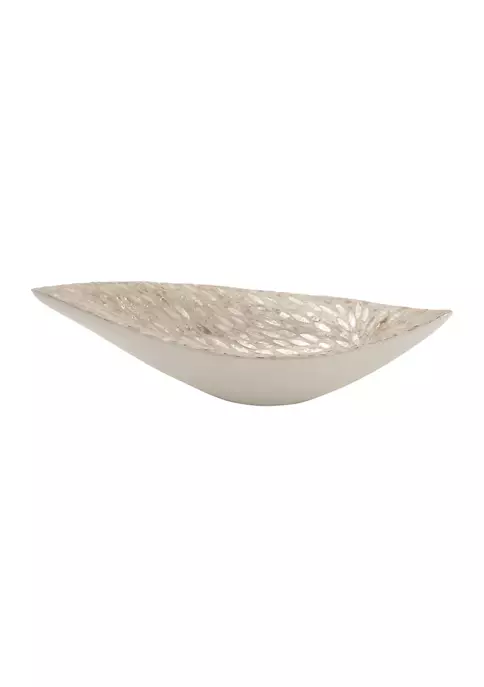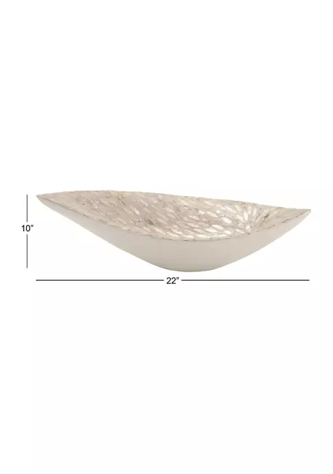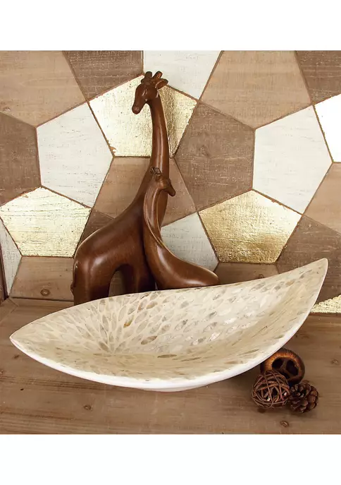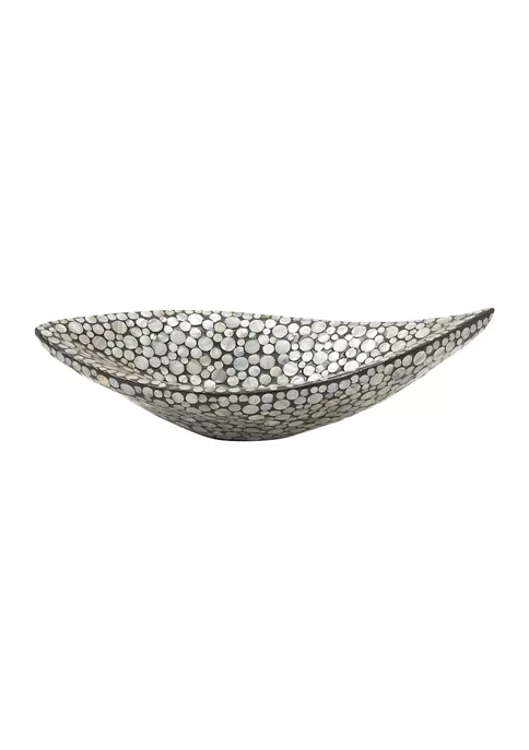 A coastal inspired space is built around the idea of a laid-back, carefree vibe. Features a luxurious leaf-shaped mussel shell and polystone decor bowl. Features reflective, beige and gray round mother of pearl tile inlays. This one-of-a-kind gray display tray showcases an irregular boat shape covered with round iridescent white Mother of Pearl inlay patterns. Gray shell bowl measures 22″ in length, 10″ in width, 6″ in height and weighs 3.25 lbs