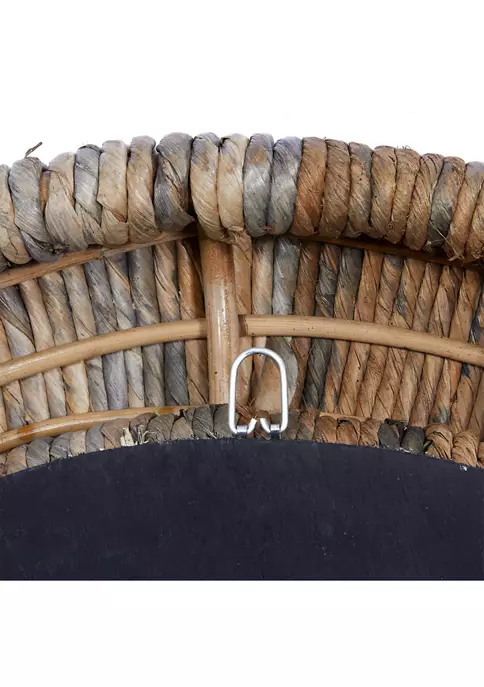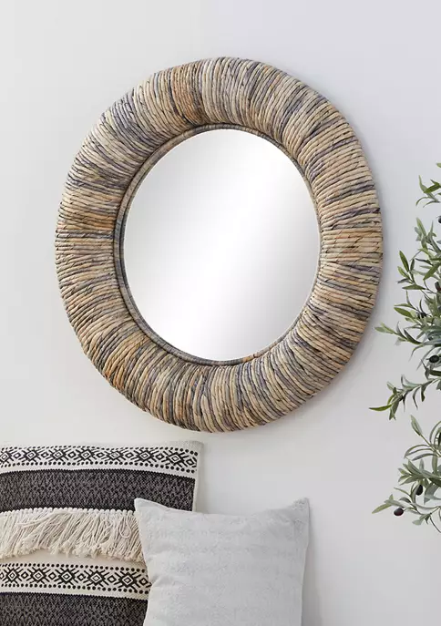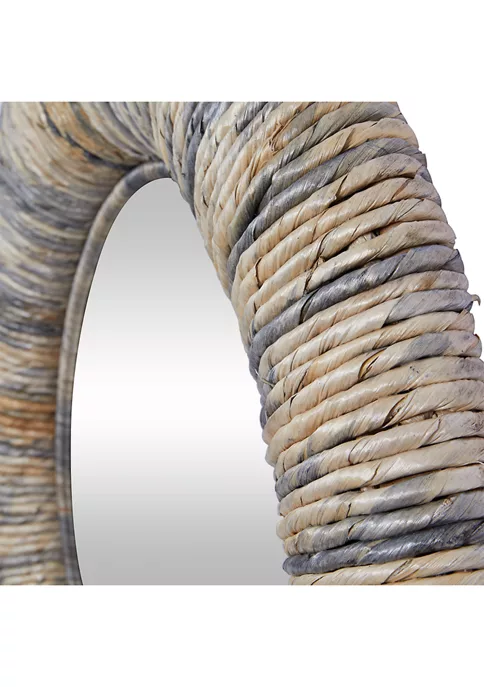 A coastal inspired space is built around the idea of a laid-back, carefree vibe. Round wall mirror is made of high quality teak wood fiber sourced from Indonesia. This extravagant wall mirror comes in a naturally textured gray and cream brown teak wood fiber finish. It showcases a stunning 2-tone dried fiber rope design forming a thick framing centered around the round mirror. Wall mirror measures 35″D x 3″W and weighs 15 lbs