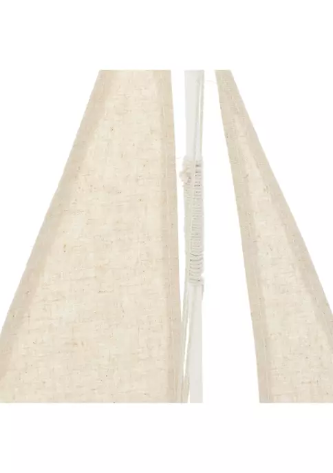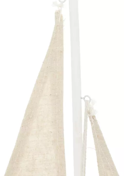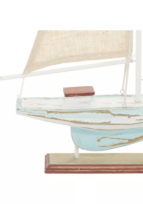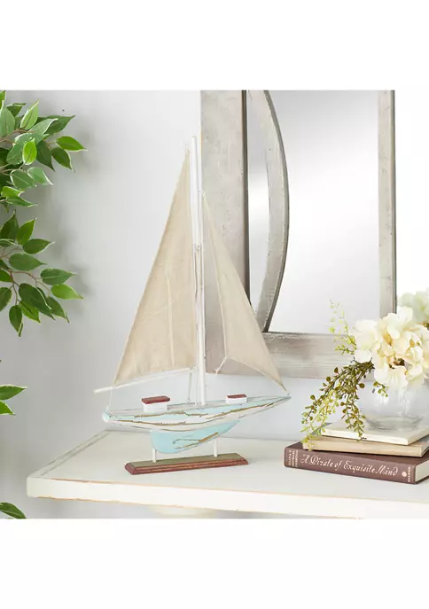 Features a coastal inspired design for that laid back coastal vibeSolid wood and linen construction provides durabilityThis sculpture is designed with two beige linen sails a light distressed blue with natural brown baseComes with a brown rectangular tiered baseIt measures 14″L x 2″W x 22″H and weighs 1 lb