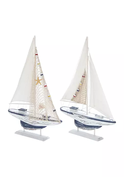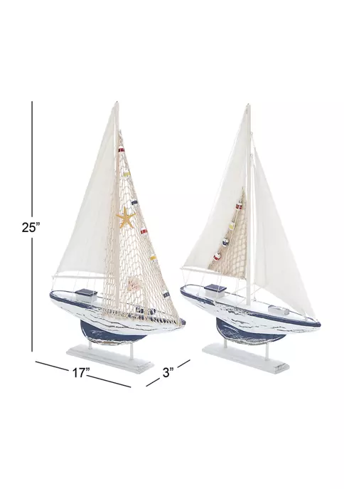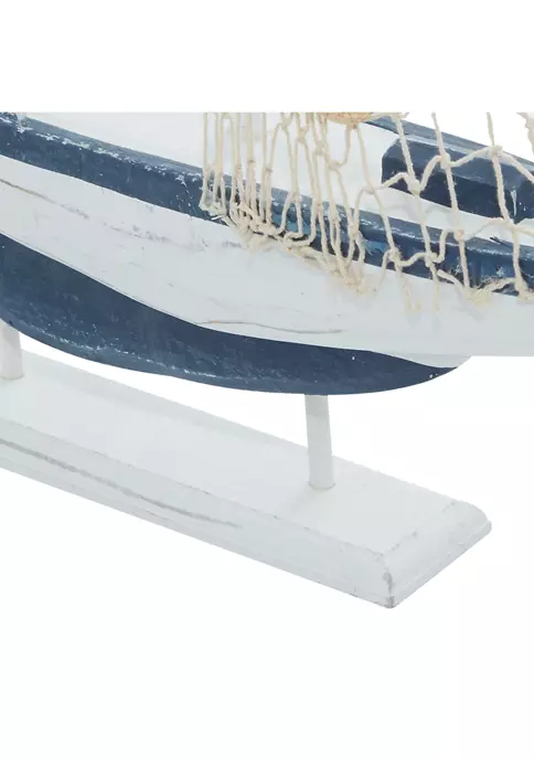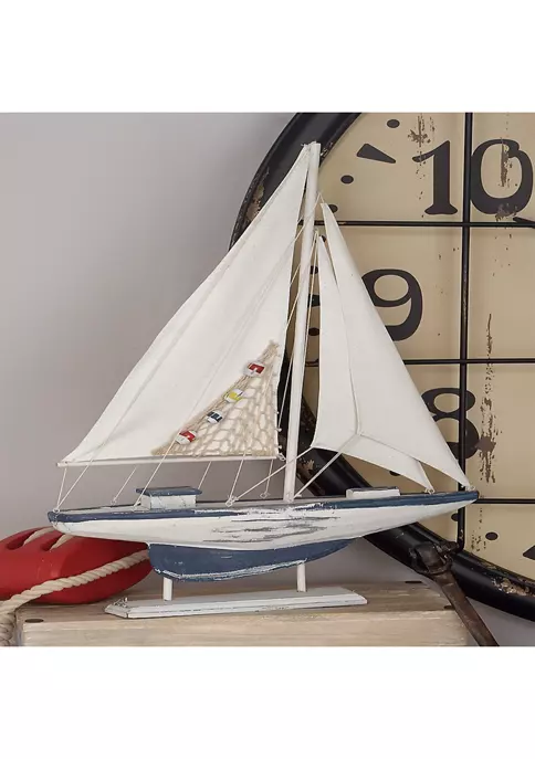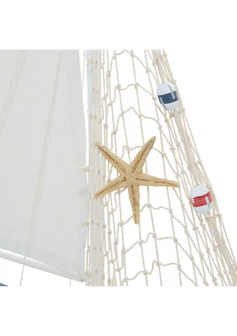 Features a coastal inspired design for that laid back coastal vibeThis item is made of a solid pine wood, linen, and jute accentFeatures a coastal style sailing boat set in a crisp and clean white finish with blue accentsThis set has white linen and netting sails adorned with multi-colored floater, shell, and starfish embellishmentsThis item measures 17โL x 3โW x 25โH; weight: 1.74 lbs