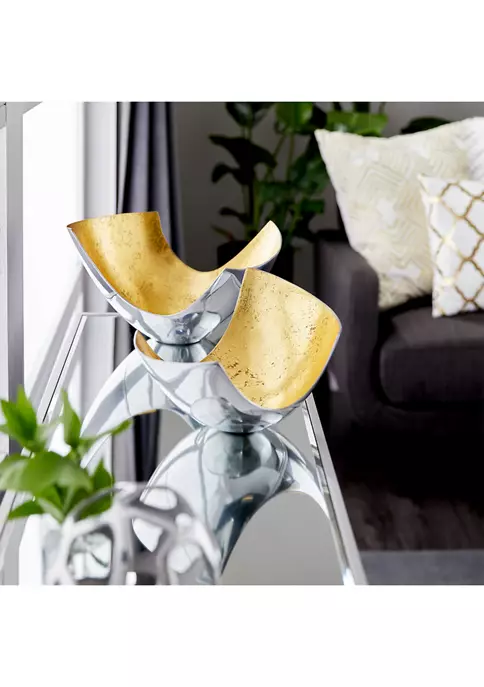 A contemporary style offers neutral elements and basic forms with a bold design. This gold bowl decor set is made from solid aluminum material. It features distressed gold interior finish for rustic effect and polished silver exterior. Our contemporary style gold aluminum bowl set features a creative and artistic take on shaping decorative bowls with a gold interior and silver exterior finish. Each bowl measures 14″L x 8″W x 9″H, 12″l X 10″w X 7″H and weighs 3 lbs