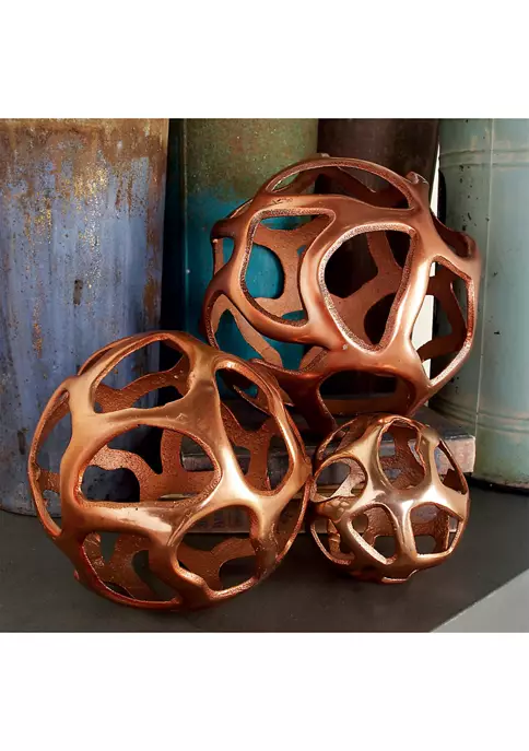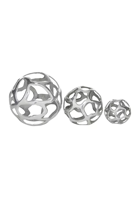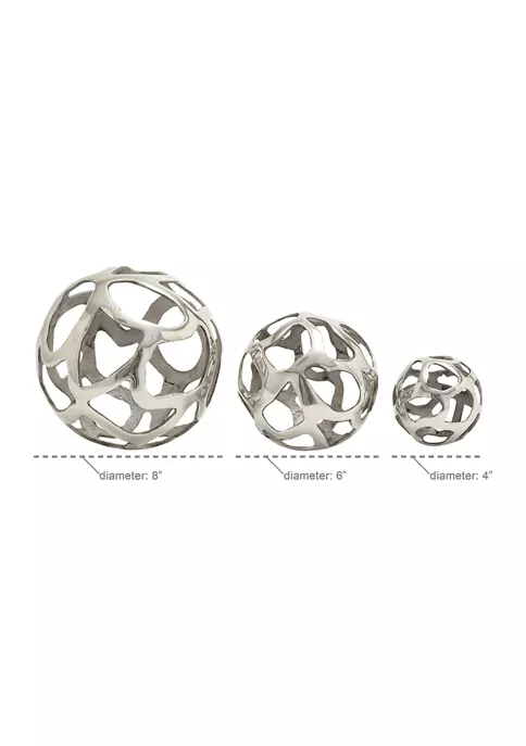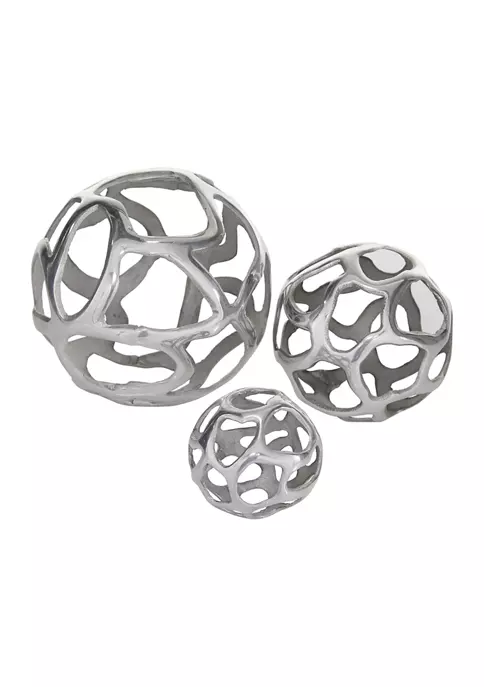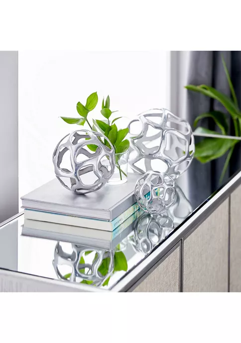Modern Reflections decorative free-form organic cut-out aluminum balls, polished silver-finish, and roughened interior surface and edges.