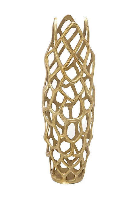 A contemporary style offers neutral elements and basic forms with a bold design. Round vase is made of a solid aluminum vase for lightweight and unique appeal. This decorative aluminum vase comes in an elegant matte gold finish. It features an elaborately crafted aluminum vase taking inspiration from plants that were grown together to form a mesh from their stems and roots all in a contemporary style inspired design. This floor vase measures 8โL x 8โW x 27โH and weighs 7.33 lbs