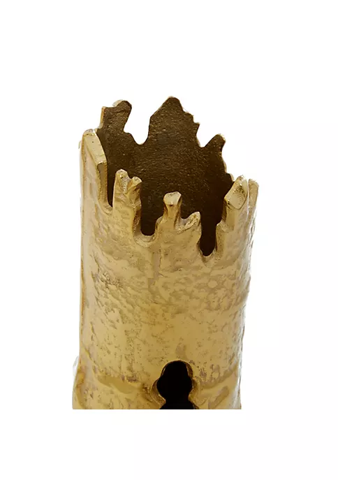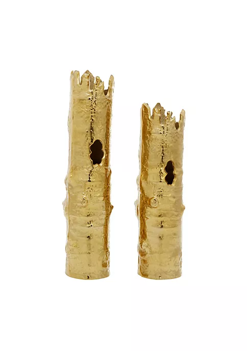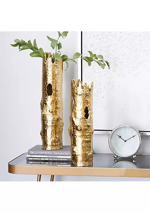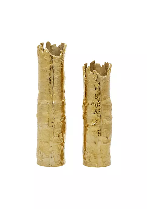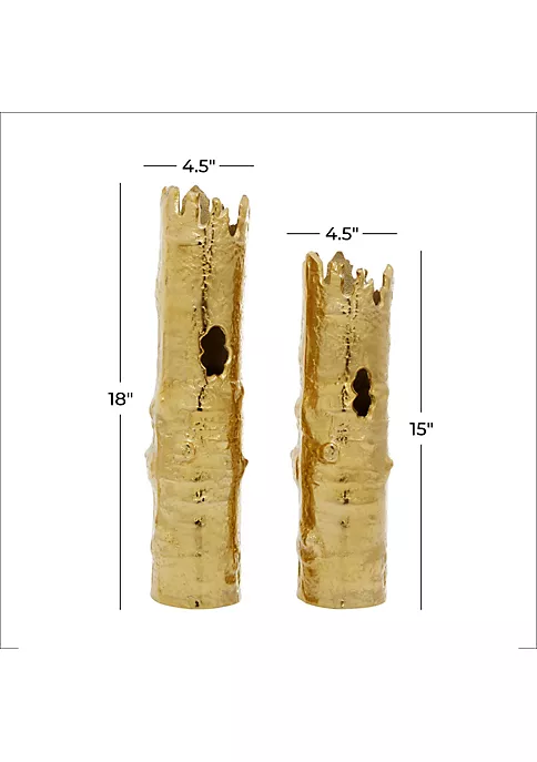 A contemporary style offers neutral elements and basic forms with a bold design. Each vase is bamboo-shaped and made of aluminum. Features high sheen metallic gold finish. Designed with uneven ridged lip and textured surface for natural look. Set of 2 that measures 5″L x 4″W x 18″H and 5″L x 4″W x 16″H and collectively weighs 8 lbs