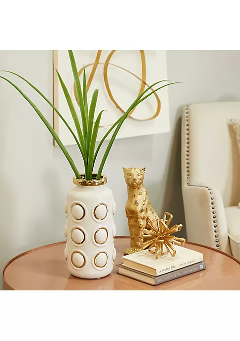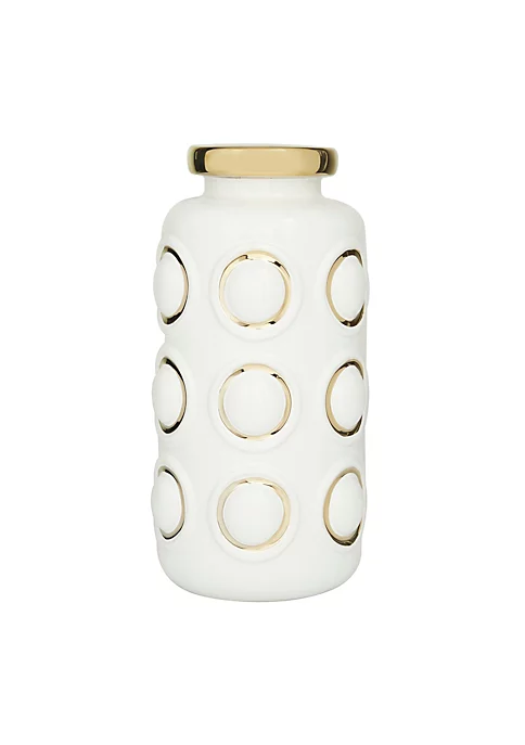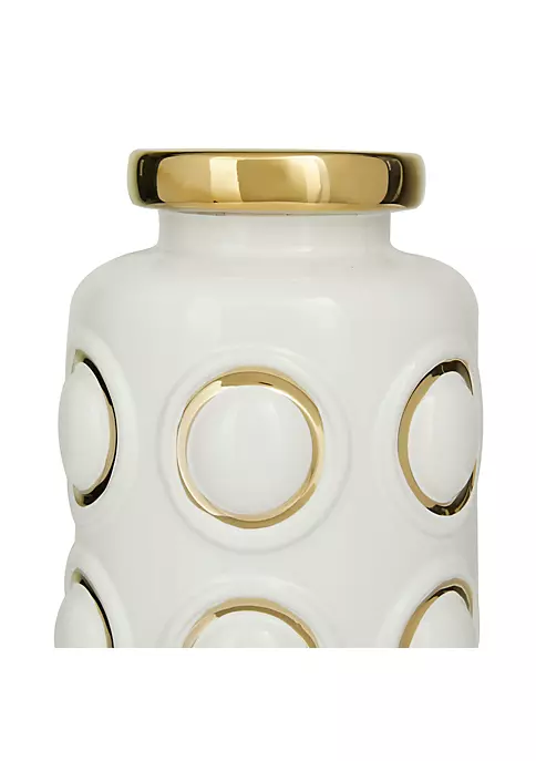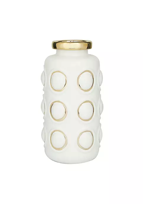 A contemporary style offers neutral elements and basic forms with a bold design. Stoneware gives this vase a solid and durable form. Metallic gold and glossy white finish flaunts this ceramic decorative vase. Bold embossed carvings of this ceramic decorative vase are highlighted with gold outline finish. Item measures 6″L x 6″W x 12″H and weighs 3 lbs