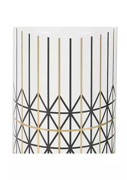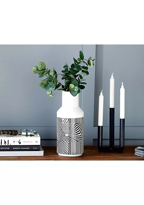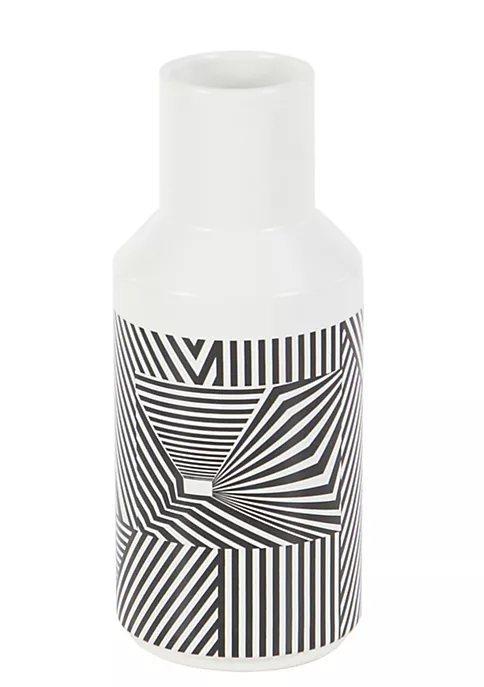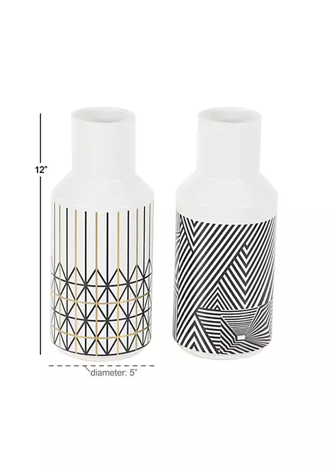 A contemporary style offers neutral elements and basic forms with a bold design. Home decor set is made of a solid ceramic vases with opaque glaze and paint. One with black and gold lines, the other with black and white psychedelic striped and chevron. Round vases features bold pattern with narrow neck and deep receptacle ideal for top-heavy flowers. Set of 2 tall vases measure 5”L x 5”W x 12”H each and weigh 4 lbs