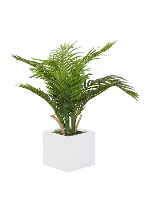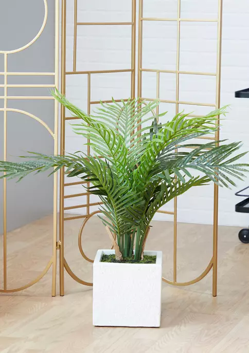 A contemporary style offers neutral elements and basic forms with a bold design. This artificial indoor plant is crafted using polyethylene leaves and stems, Styrofoam and cement filler, and a fiberglass planter. It carries glossy green leaves and a smooth white planter. Our artificial foliage features a floor plant size and a simple greenery arrangement in a square pot. Potted artificial plant measures 28″L x 40″W x 33″H and weighs 16 lbs
