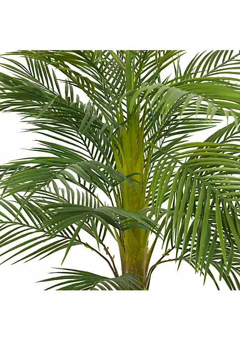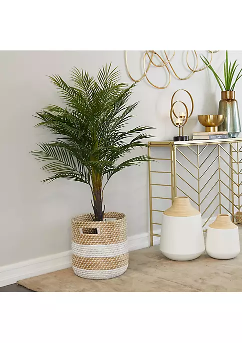 A contemporary style offers neutral elements and basic forms with a bold design. Plant decor for home crafted of solid and long-lasting resin and melamine materials. An artificial plant featuring green leaves with a black container. An artificial plant arrangement featuring a needle kwai plant with a green finish, realistic long leaves, stems, and trunk along with decorative pebble stones and black segmented cylindrical container. Item measures 32″L x 32″Wx 43″H and weighs 9 lbs