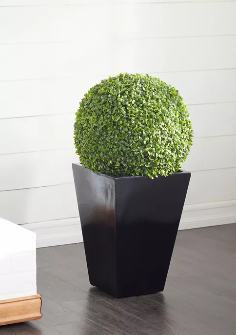 A contemporary style offers neutral elements and basic forms with a bold design. Artificial indoor plant is crafted using polyethylene leaves, Styrofoam and cement filler, and a fiberglass planter. Plastic topiary carries a smooth green finish and a glossy black planter. Artificial foliage features a floor plant size and a ball silhouette in a trapezoid pot. Topiary measures 17″L x 17″W x 32″H and weighs 24 lbs