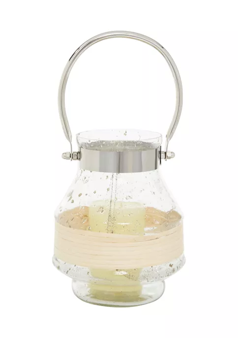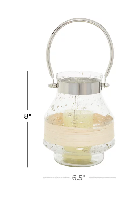 A contemporary style offers neutral elements and basic forms with a bold design. Silver metal and beige ribbon strips decorate the clear glass lantern. Silver metal and beige ribbon strips decorate the clear glass lantern. It’s meant to hold one standard size votive or pillar candle, but it can also function as a table display and hanging lamp Decor. Measurements: 6″L x 7″W x 8″H and weighs 2 lbs