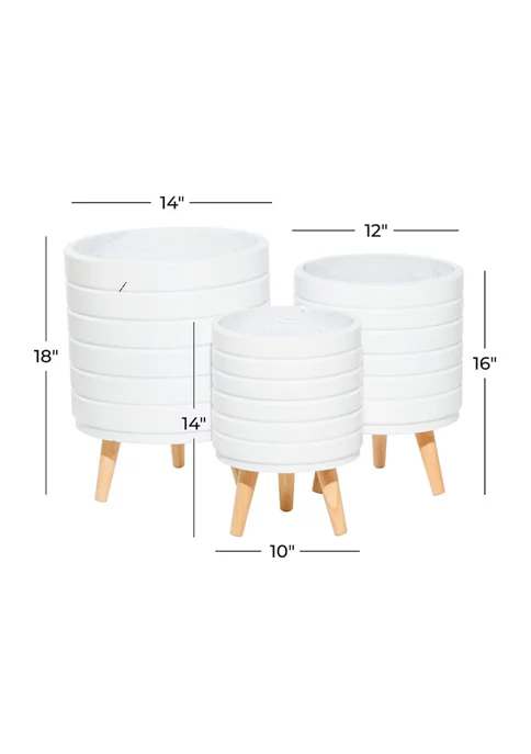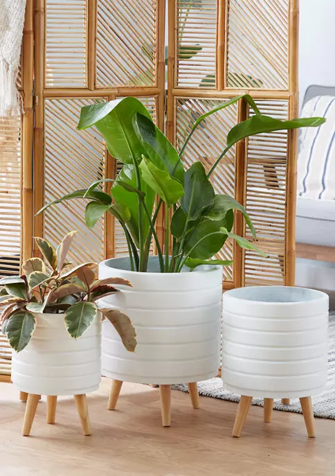A smart chic style inspired living space knows how important mixing and matching is, especially when it comes to adding some greenery in your space. This round white fiber clay horizontal etched lines planter is up for that task. The fiber clay construction of this planter means toughness without sacrificing beauty and elegance thanks to its horizontal etched lines pattern design on the surface. The entire piece rests on a wooden tripod leg design with circular wooden legs in a light brown hue. This planter set will bring a much-needed freshness with indoor plants to your living room, dining room, home office or entry way. Ships in 1 carton. Suitable for indoor and outdoor use. No drainage holes. Each set includes with 3 planters. Contemporary design.