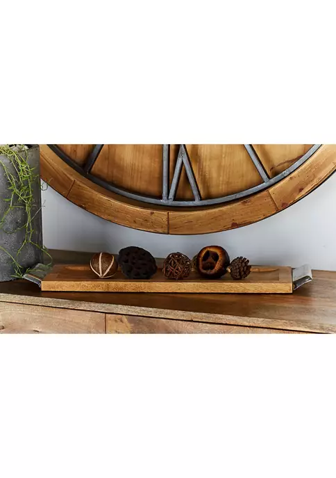 A contemporary style offers neutral elements and basic forms with a bold design. These decorative wooden trays are made of high quality mango wood and aluminum materials. Features a solid rectangular shape with stylish handles and natural mocha and mixed shades of brown finish. This set of contemporary wooden desk trays feature a natural-finished rectangular wooden tray with slanted aluminum metal handles. This set measures 27″L x 6″W x 1.25″H, 23″L x 6″W x 1.25″H, and collectively weighs 7.15 lbs