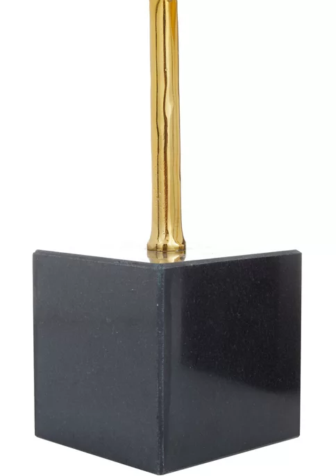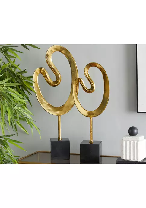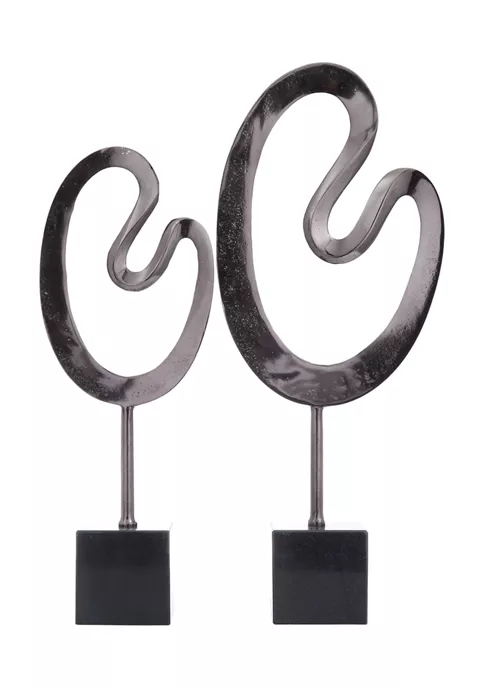 A contemporary style offers neutral elements and basic forms with a bold design. These intriguing black abstract sculptures are crafted of high quality aluminum and marble. These metal art sculptures feature a textured metallic black aluminum finish and a black marble finish. These art deco sculptures feature abstract formed oval rings with a lower metal rod stand and a classic marble cube platform. This set measures 10″L x 4″W x 24.3″H, 7.7″L x 4.3″W x 21″H, and weighs 6, 5 lbs each