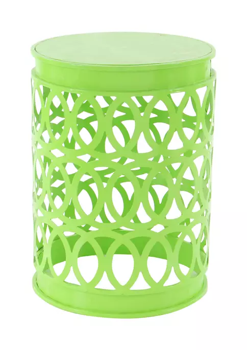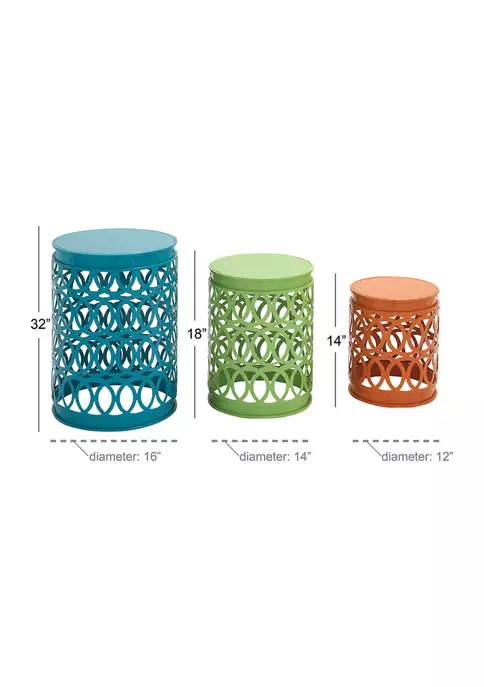 Set of three Great Outdoors iron all-weather outdoor round accent tables, turquoise, spring green and melon orange paint-finish iron, latticed cut-out overlapping circles trellis sides, slightly recessed solid iron base and top rim bands with raised dimple design, solid flat table tops Trio of bright blue, green, and orange round metal side tables . Solid iron side tables. Bright pops of color with pierced metal circle designs. Set of 3 outdoor tables measure 16″L x 16″W x 22″H, 14″L x 14″W x 18″, and 12″L x 12″W x 18″H. Complement eclectic and coastal style spaces.