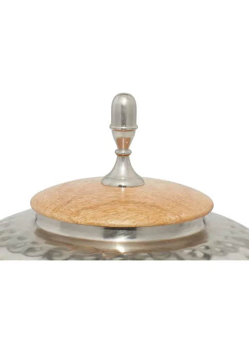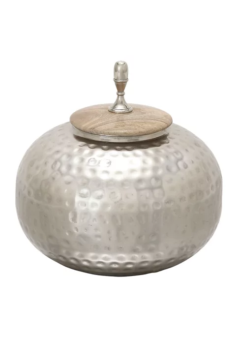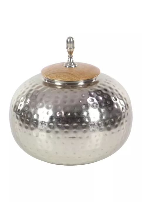 A contemporary style offers neutral elements and basic forms with a bold design. This contemporary style silver jar is made from iron and wood materials. This contemporary style jar comes in a polished silver finish. Features a round wooden lid with knob finial. Round urn jar measures 11” in length, 11″ in width, 12″ in height and weighs 3.3 lbs