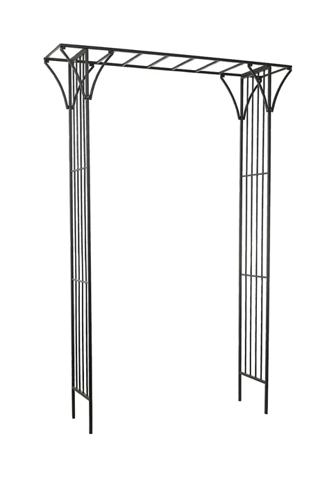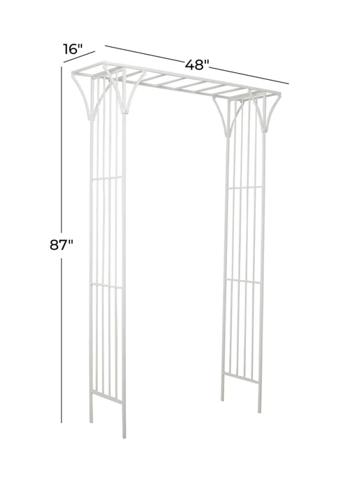 A contemporary style offers neutral elements and basic forms with a bold design. Garden decor is crafted with iron for a solid and durable form. An ivory white finish highlights this garden arbor arch. An extravagant display features tall garden arch with structured frame and added scrollwork detailing for a touch of elegance. This item measures 48″L x 16″W x 87″H and weighs 27 lbs