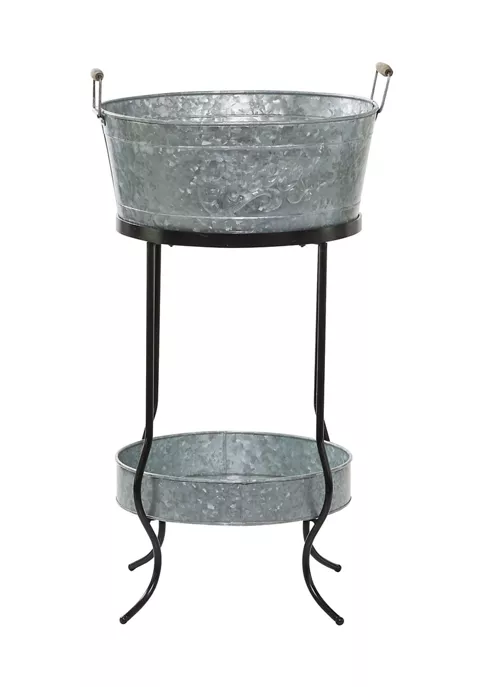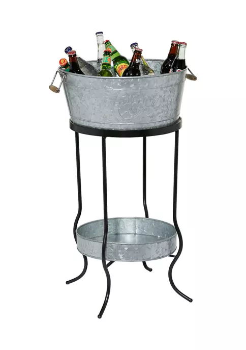 A contemporary style offers neutral elements and basic forms with a bold design. Modern bucket cooler is crafted with solid metal material. Bucket cooler with tray highlights a gray galvanized finish and glossy black frame finish. Gray galvanized bucket cooler features a bottom tray held by curved leg stands. Each item measures 19″L X 9″W X 34″H; and weights 12.5 lbs