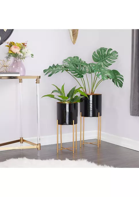 A contemporary style offers neutral elements and basic forms with a bold design. Indoor and outdoor contemporary flower pots are made of solid and robust iron. Round floor planters and stands highlight a black high sheen exterior and a metallic gold interior and leg finish. Our two-toned black planter pots feature deep cylindrical potted structures with a tall and slim 4-leg metal stand. Each item measures 10″L x 10″W x 24″H, 9″L x 9″W x 21″H and weighs 10 lbs