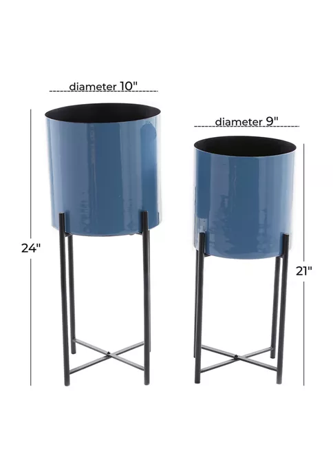 A contemporary style offers neutral elements and basic forms with a bold design. A set of contemporary inspired planters made of robust metal that can stand the test of time. Set of 2 planters comes in black interior and stands as well as glossy blue exterior. Round blue floor planters feature metal cylindrical pots supported by open metal stands with X-shaped supports for an elevated display of any plants. Each item measures 10″L x 10″W x 24″H , 9″L x 9″W x 21″H and weighs 10 lbs