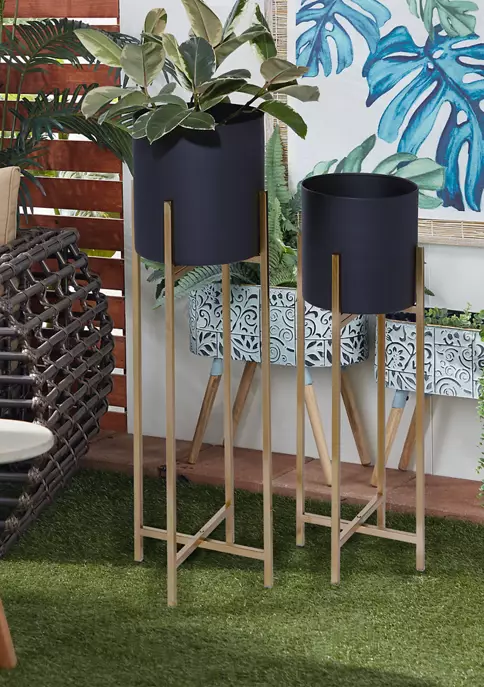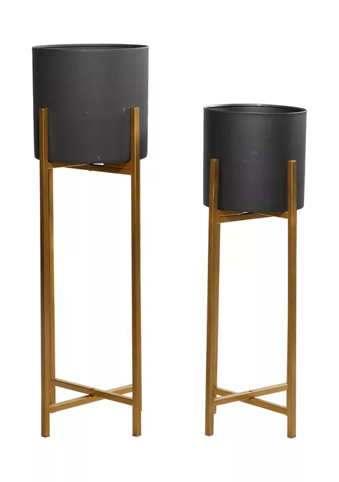 A contemporary style offers neutral elements and basic forms with a bold design. A reliable construction of iron was used in crafting these indoor planters with no drainage holes. Matte black finished planters elevate from the ground via glossy gold stands. These cylinder planters differ in depth and balance on tall X-shaped stands that vary in height. Each item in this set measures 12″ X 36″, 11″ X 30″ and weighs 12 lbs