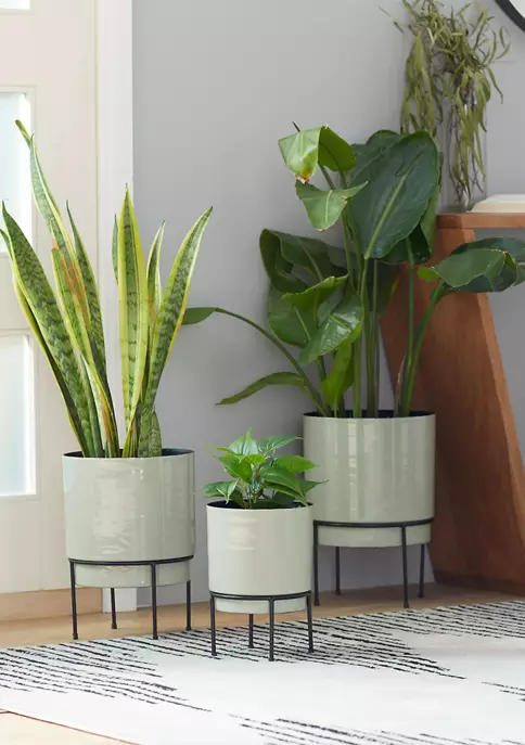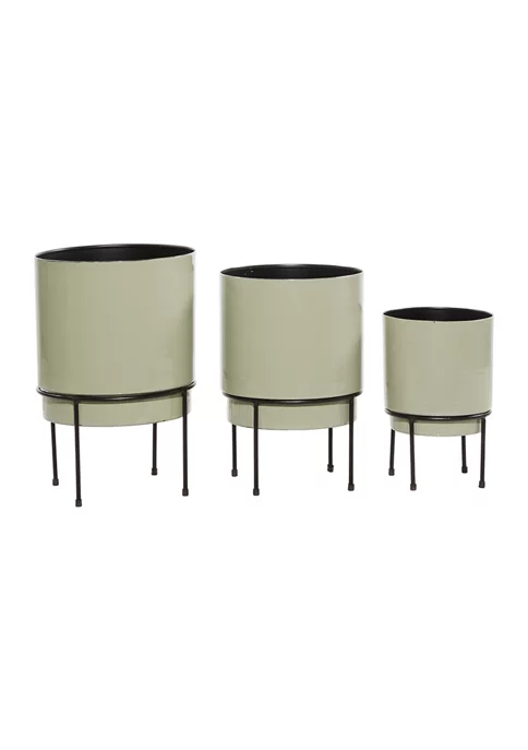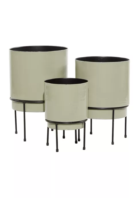 A contemporary style offers neutral elements and basic forms with a bold design. Item are crafted with solid iron for sturdy and durable structure. Highlights a muted green exterior finish with ebony black interior and leg stand finish. This planter set is designed with low profile slender leg stands. Each item in this set measures 7″L x 7″W X 10″H, 9″L x 9″W X 13″H, 7″L x 7″W X 10″H total weight 11 lbs