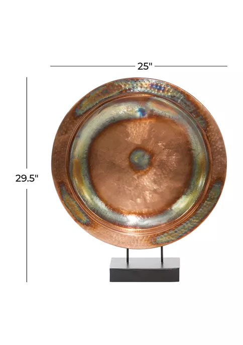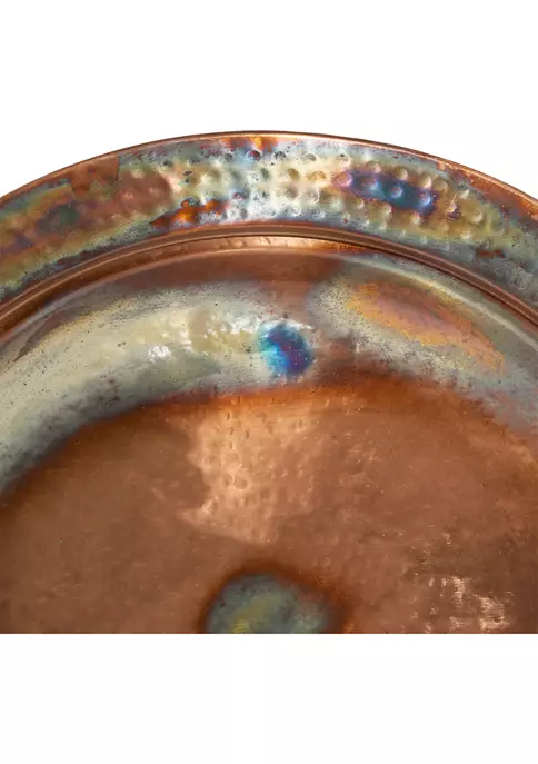 A contemporary style offers neutral elements and basic forms with a bold design. Item crafted of a solid metal. This hammered copper charger plate is designed with patina finish. Features a round charger plate with rectangular stand. Item measures 25โL x 5.55โW x 29.55โH and weighs 7 lbs