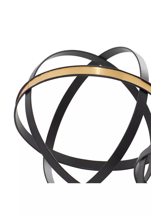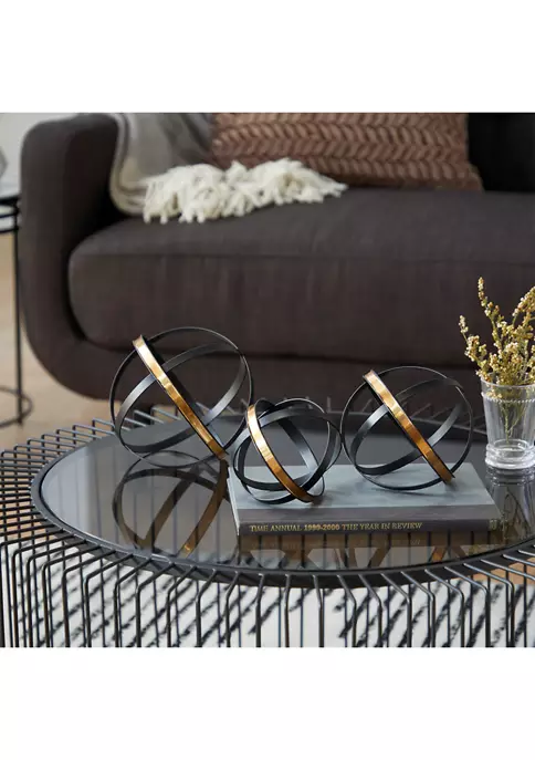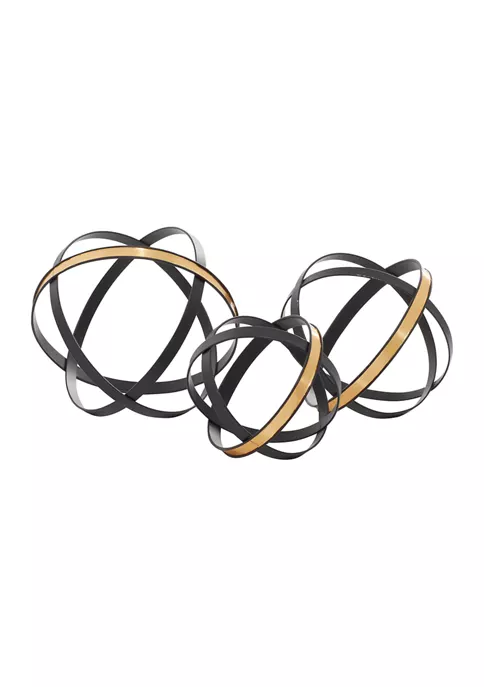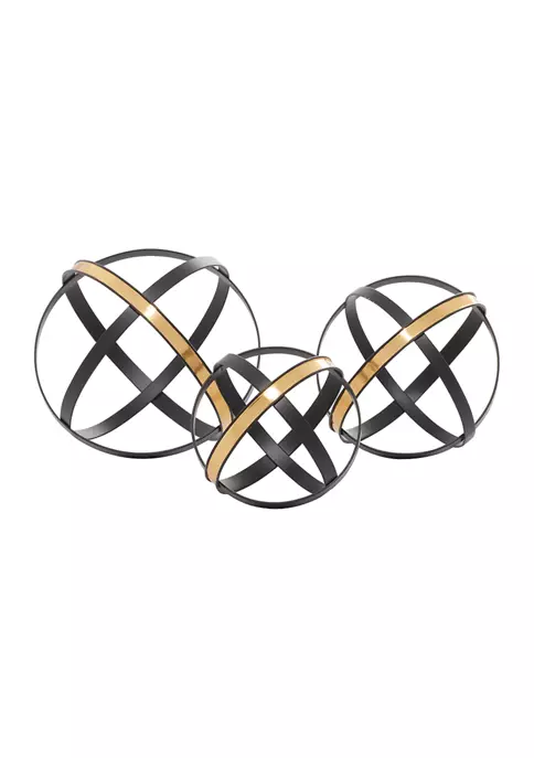 A contemporary style offers neutral elements and basic forms with a bold design. Table sculpture is made of solid iron strips forming orb shapes. Round orb decor with matte black finishes, accented with metallic gold strips. Neutral toned lightweight decor fit for any room. Each item measures 5.95″ x 7.00″ x 7.00″, 5.10″ x 6.00″ x 6.00″, and 4.30″ x 4.85″ x 4.85″; and collectively weights 1 lbs