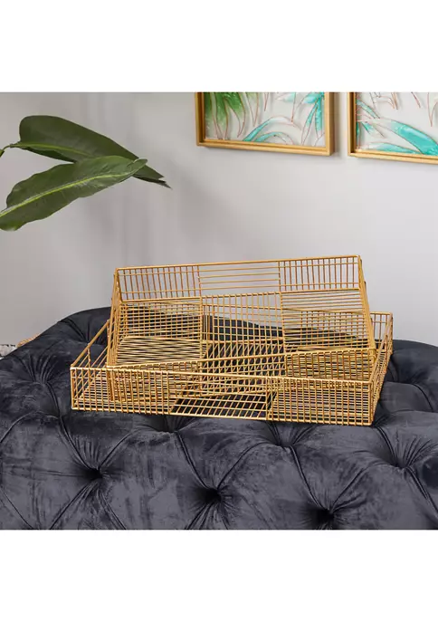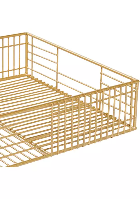 A contemporary style offers neutral elements and basic forms with a bold design. Rectangle trays are crafted from sturdy solid metal. Features semi matte gold finish. Trays feature handles for easy carry and eye catching design ideal for decorative storage unit on your mantle, console or coffee tables. Each item measures 3.25″ x 17.25″ x 11.15″, and 3.25″ x 19.10″ x 12.60″; and collectively weights 5 lbs