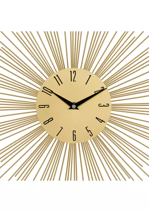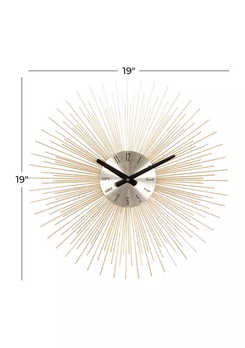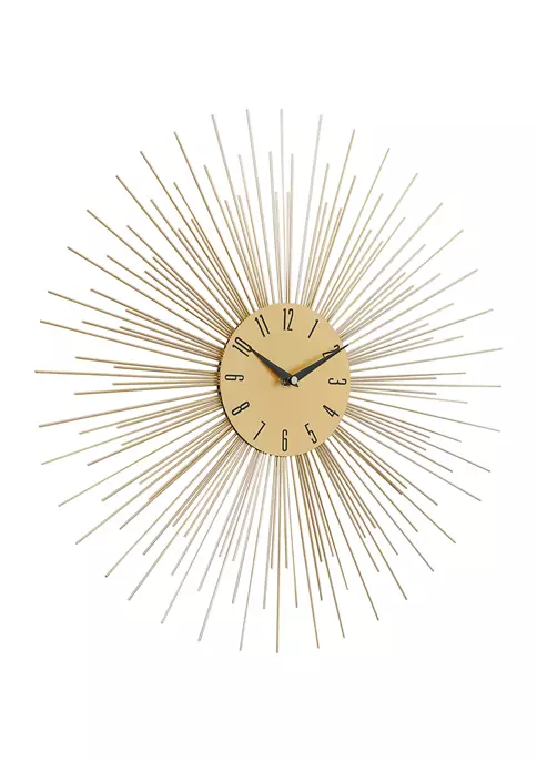 A contemporary style offers neutral elements and basic forms with a bold design. This wall clock are constructed of a solid iron for durable structure. Polished silver clock face, black hour and minute hands, gold sunburst rays. Features a small clock face with oversized hour and minute hands. This item measures 20″L x 2″W x 20″H and weighs 2 lbs