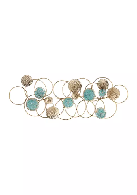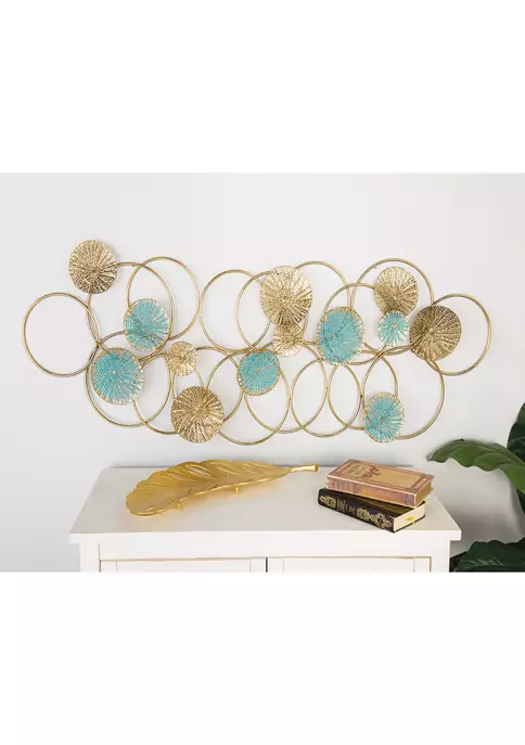 The best accessory for a wide array of home designs, especially contemporary.This disc wall art décor is crafted with solid iron materialThis disc wall décor features metallic gold finish with sapphire blue accent finish over perforated detailsDesigned with thirteen various-sized iron discs in rose gold and chalk blue textured finishAbstract gold wall art measures 48” in length, 2″ in width, 16″ in height and weighs 1.2 lbs.