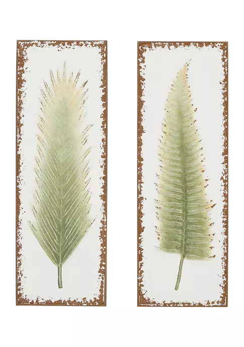 A contemporary style offers neutral elements and basic forms with a bold design. These rectangular wall decorations are creative products of solid iron. This 2-piece wall decor set has a rustic white background and green leaves printed on the embossed centers. This contemporary-themed wall decor set features two leaf prints on embossed metal canvases. This item measures 1-piece dimensions: 12.5″ X 36″, total weighs 7.4 lbs.