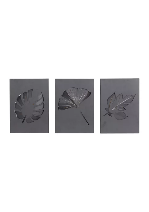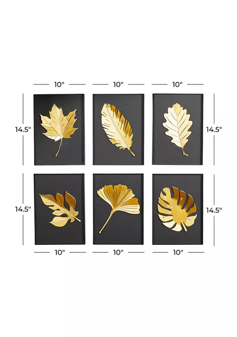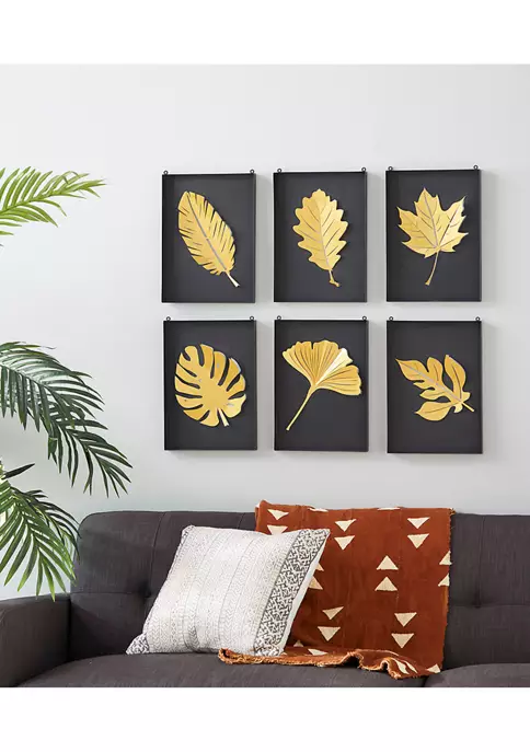 A contemporary style offers neutral elements and basic forms with a bold design. Leaf wall decor made of a solid metal frame. Features a matte finish with black background and gold leaves. This glamorous wall decor is both stunning and captivating in color and design, featured various gold leaves on a solid black background for a pop of color. Each item measures 14.55″ x 10.20″ x 1.25″, and collectively weights 9 lbs