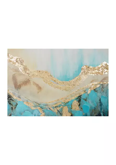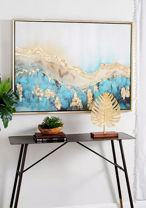 A contemporary style offers neutral elements and basic forms with a bold design. An abstract canvas wall art decor constructed of solid polystone, fir wood, and canvas. This canvas wall art for living room showcases a multicolored acrylic painting that goes well with contemporary-themed interior. Blended vertical lines, large sweeping brushstrokes, and impasto dollops form an abstract design across the canvas which may be interpreted as a landscape painting. This contemporary wall decor piece measure 47.5” x 35.5” x 1.5” and weighs 6.5 lbs.