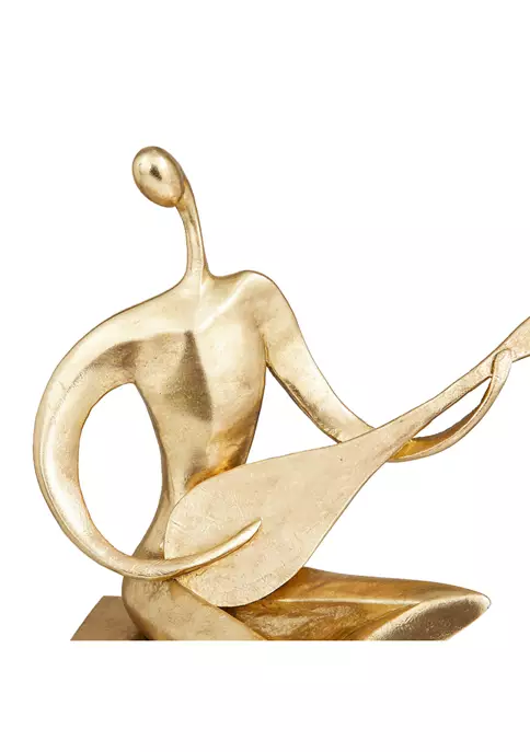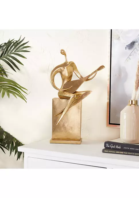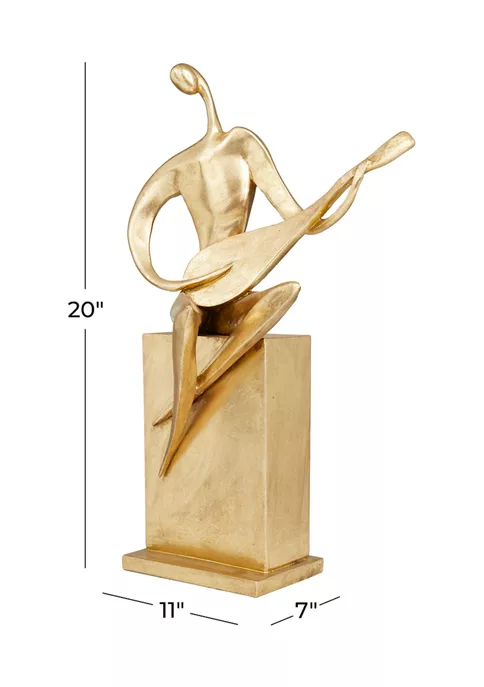 A contemporary style offers neutral elements and basic forms with a bold design. This abstract art sculpture is crafted from lightweight polystone material. This elegant musician sculpture features a metallic gold finish. This ceramic abstract sculpture showcases a blank human figure sitting on a rectangular base while playing a spoon-shaped guitar. This item measures 11.5″L x 7″W x 20″H and weighs 6.27 lbs