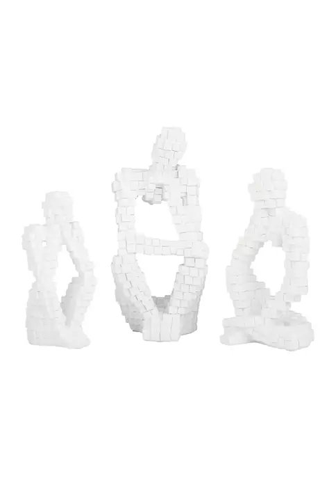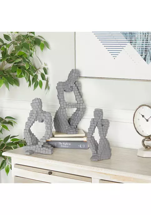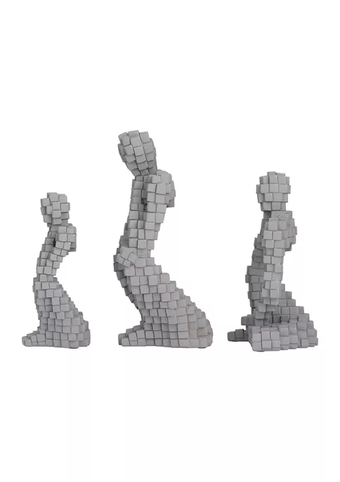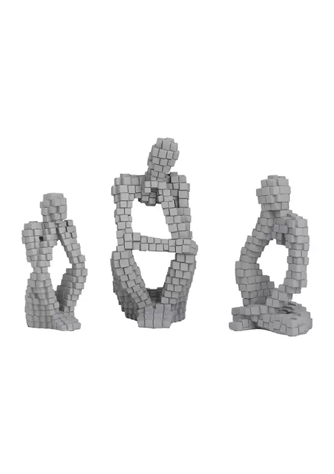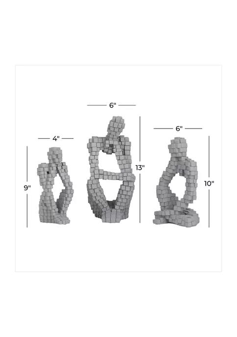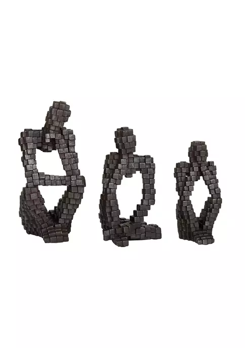 A contemporary style offers neutral elements and basic forms with a bold design. These small thinking man figurines are made of lightweight polystone. This remarkable set of thinking man statues feature a textured black polystone finish. This modernized set of thinking man sculptures feature a collection of mini cube blocks forming abstract brick figures of three grown men sitting on the ground with their hands placed on their chins. Each item measures 6″L x 6″W x 13″H, 6″L x 5″W x 10″H, 4″L x 4″W x 9″H and weighs 5 lbs