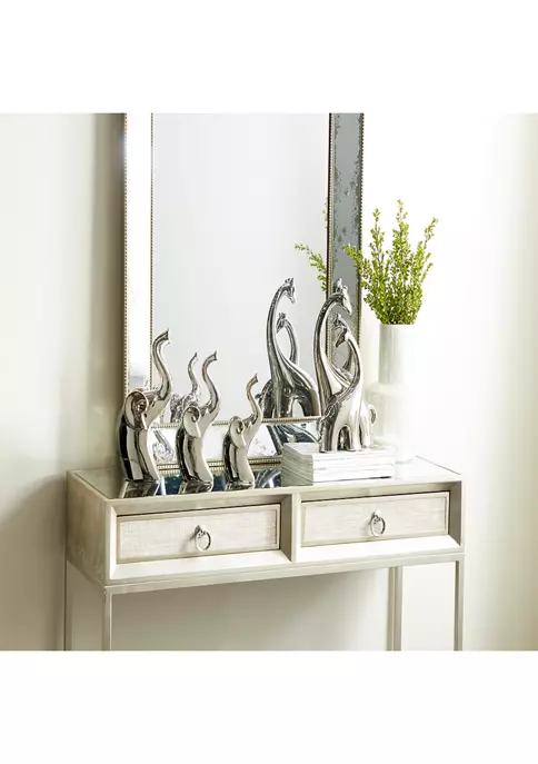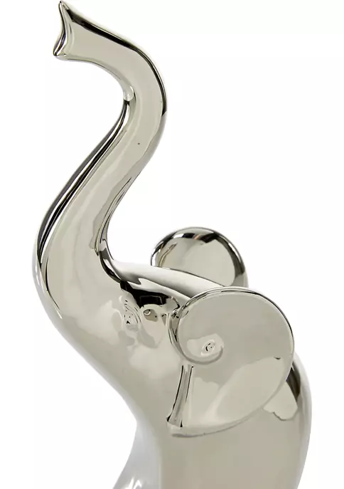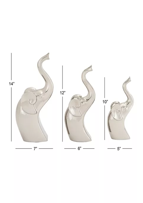 Designed with a contemporary inspired style for a sophisticated lookThis unique sculpture set is made from porcelain ceramic materialsThey come in a polished silver finish for a glamorous vibeThese unique sculpture pieces feature 3 abstract elephants raising their trunks up in the air forming a letter “S”Each item measures 7″L x 3″W x 14″H, 6″L x 3″W x 12″H, 5″L x 2″W x 10″H and weighs 4.4 lbs