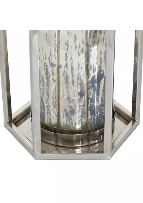 A contemporary style offers neutral elements and basic forms with a bold design. Made of stainless steel and glass. Comes with stainless steel open frame with top handle for easy transport. Designed with large distressed pillar candle cover. Item measures 10.35”L” x 11”W x 18.15”W and weighs 8 lbs
