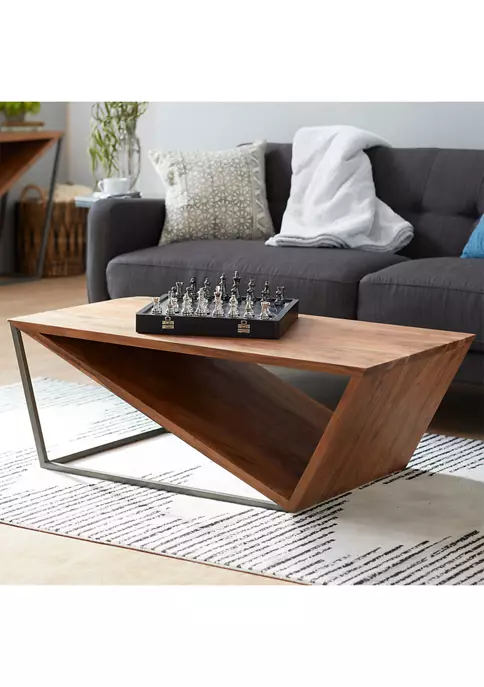 A contemporary style offers neutral elements and basic forms with a bold design. Black and brown rectangular coffee table is a made of wood and iron materials. Modern console table carries a mahogany brown wood finish and coal black metal finish. Open style rectangle coffee table features two triangular design made of wood and metal in a stacking structure that provides additional storage space for an eye catching display. This geometric coffee table measures 45″L x 24″W x 16″H and weighs 77.5 lbs
