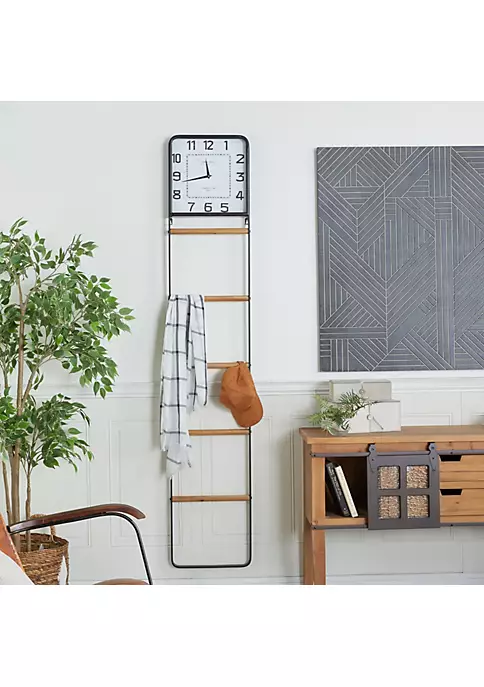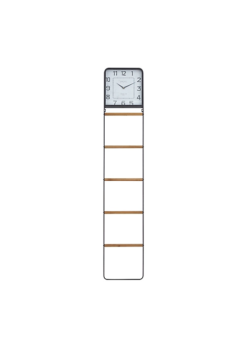 Crafted to offer any country cottage themed home a final touch, with an elegant rustic appeal. Ladder decor is crafted with iron and wood for a solid and durable form. Ladder rack with clock highlights a black matte finish with racks in natural wood. An analog clock completes the look of this wall-mounted ladder rack that carries horizontal wooden poles for a convenient storage and display. This item measures 14″L x 3″W x 87.6″H, and weigh 10 lbs