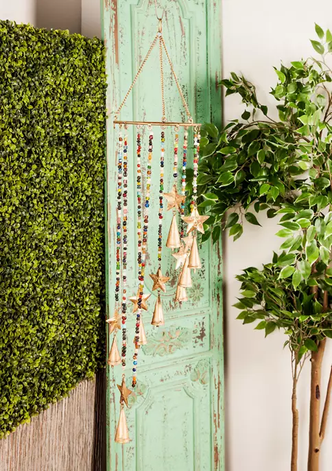 Express your personality with eclectic design and transform your space into a diverse mixture of colors and patterns. Made of a solid iron for durability. Features gold conical bells and multi-colored glass beads. Designed with gold-finished star figures suspended from a circular platform, with chain links connected to a loop ring hanger. Measurements: 7”L x 7”W x 26”H; weighs 0.6 lb