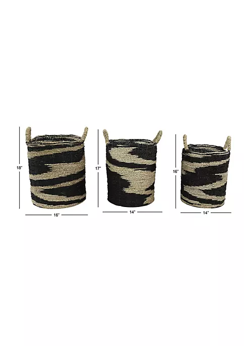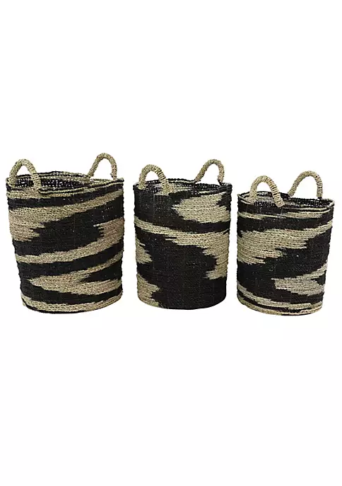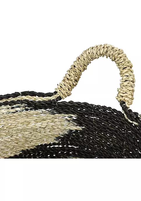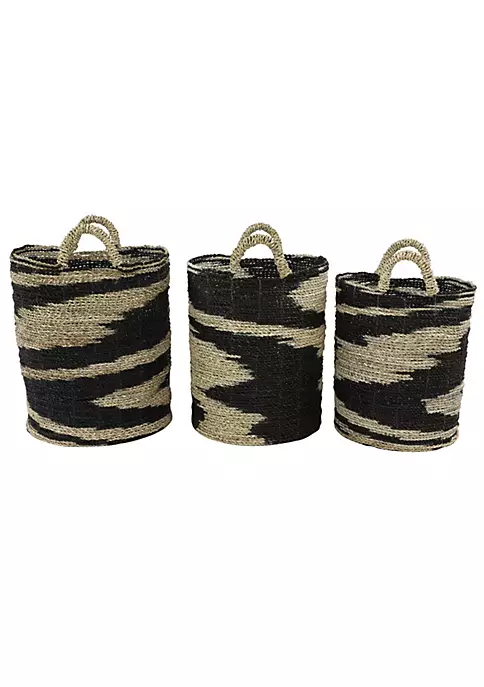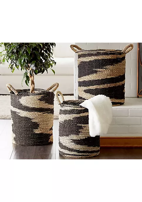 Express your personality with eclectic design and transform your space into a diverse mixture of colors and patterns. Each storage basket is woven with dried and preserved seagrass. The bold contrast of the black and natural swirling design plus additional texture and shapes from the natural-colored, thick, twisted, banana leaf handles make these baskets dynamic and stylish. Each wicker storage basket features eccentric woven twisting patterns with side woven handles. These nesting wicker baskets with handles include sizes 16” x 18”, 14” x 17”, 13” x 16” and collectively weigh 6 lbs; handles measure 4”