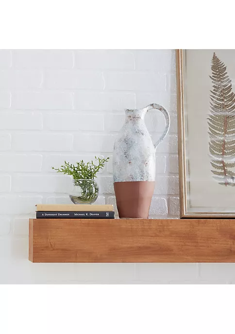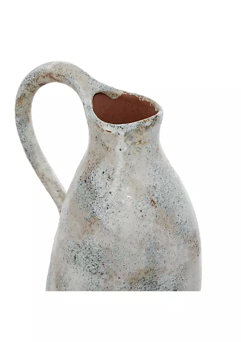 Enhance your farmhouse inspired home with classic style and a touch of cozy appeal. Solid ceramic stoneware vase. Bubbled white glaze with stone finish throughout the top, matte rust brown base and interior. This ceramic white vase features a lekythos-inspired shape with half-tipped design. Pitcher vase measures 5.5″L x 7″W x 14.5″ and weighs 3.5 lbs