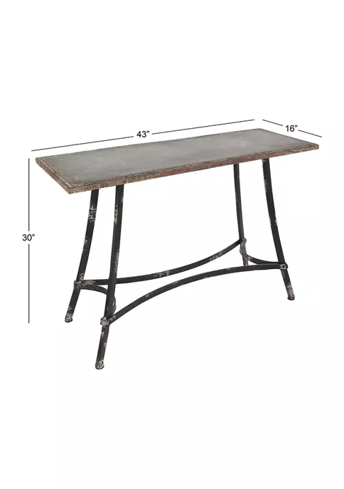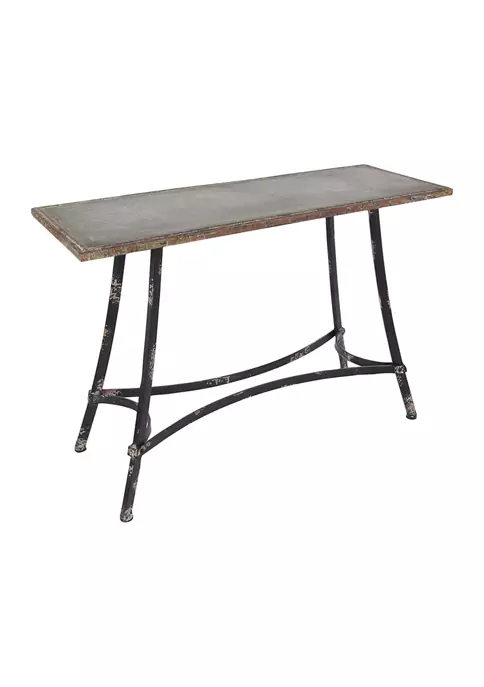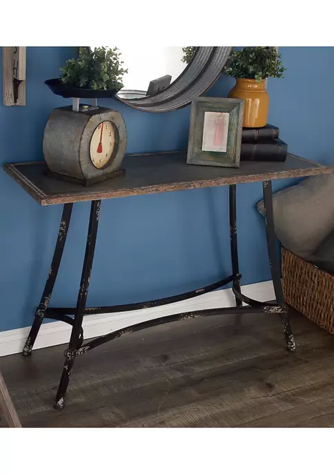 An industrial arts metal console table, with a rectangular tabletop a distressed finish, and black iron legs and bracket.