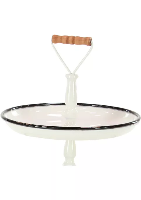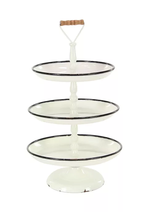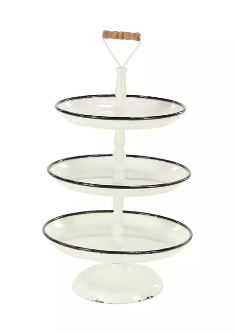 Enhance your farmhouse inspired home with classic style and a touch of cozy appeal. This 3 tiered metal serving stand is made of sturdy iron and wood materials. Comes in a clean white finish with black pin stripes on tray rim edge. This elegant white tiered serving stand features 3 round-shaped trays with a black rim design and a wooden stand handle on top. Tray measures 25″ x 15″ X 15″ and weighs 4.90 lbs